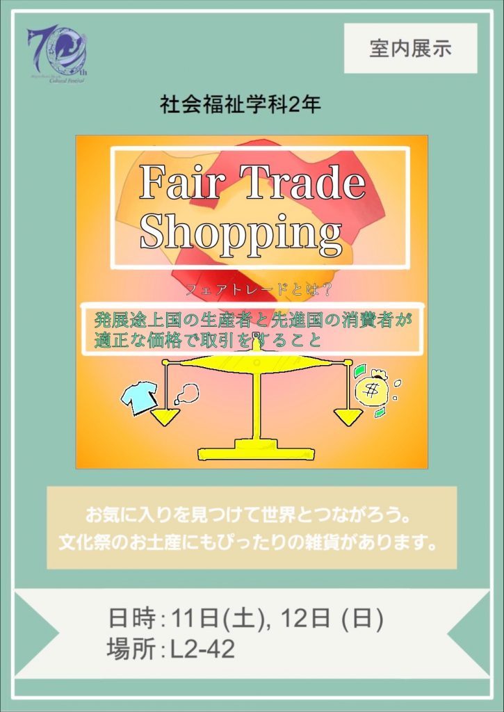1年生は、チュロス&アイスの販売、2年生は『フェアトレード概論』を受講中の学生たちが、発展途上国の生産者の方々が作られた商品の販売、MUKOnnectは防災お菓子ポシェット作りのコーナーを出します。