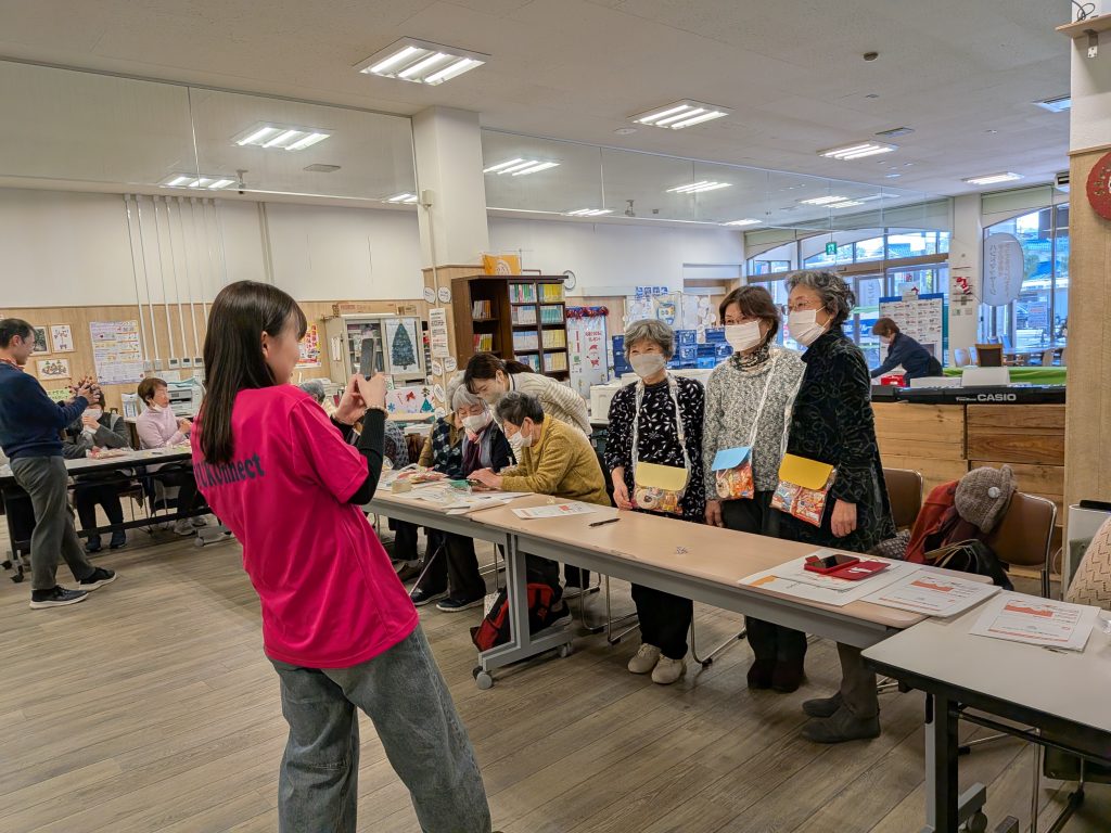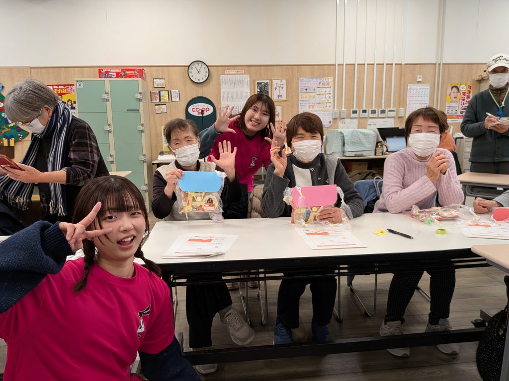 いつもは、子ども向けに防災お菓子ポシェットを実施していますが、今回は初めて高齢の方向けに行い28名もの方が集まってくださり大盛況でした。