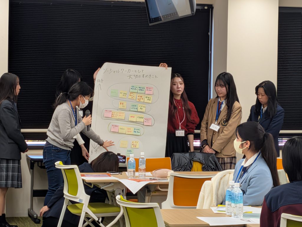 12月14日第3回入学前教育(対面)を行いました!! お知らせ 2025.12.17 本日の入学前教育には、2026年4月入学予定の高校生たちが48名(内オンライン2名)が参加しました。はじめは、皆さん緊張している様子でしたが、在校生21名がそれぞれに声をかけ少しずつ緊張が取れていっていました。途中「ソーシャルワーカーとして大切にすべきこと」について、班ごとにディスカッションをしてもらい、最後に発表をしました。各班ともにディスカッションした内容をカテゴリーに分類するなどして発表していました!次回は、3月21日にまた対面でお会いしましょうね!!