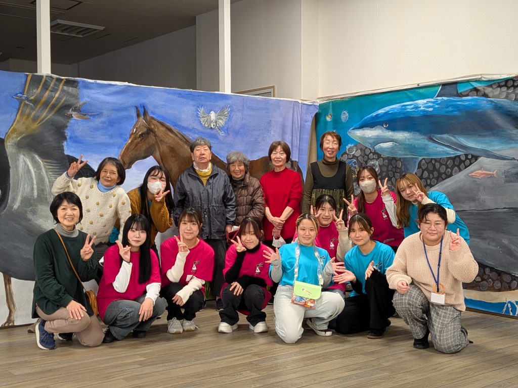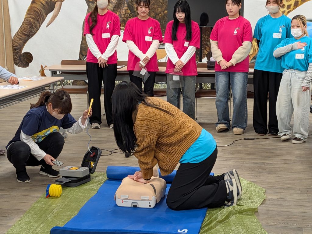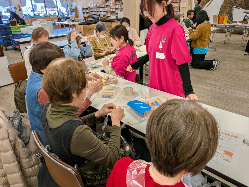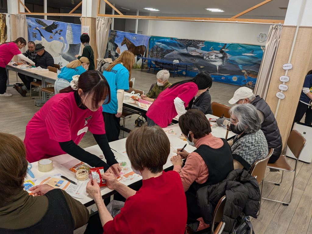 第2弾!大庄元気むらにて防災お菓子ポシェット作り開催。 お知らせ 2026.03.26 1月10日、尼崎市にある『大庄元気むら』で防災お菓子ポシェットつくりを行いました。防災士の方から救命処置の方法について地域の方々と一緒に教わったあと、防災お菓子ポシェットつくりを行いました。今回は1年生だけの実施ということもあり、学生たちは少し緊張をしていたようですが、分担した役割を互いにサポートしながら、前回の反省点を実践に活かしていました。話すスピードや説明の仕方など参加者に合わせて工夫している様子がうかがえました。