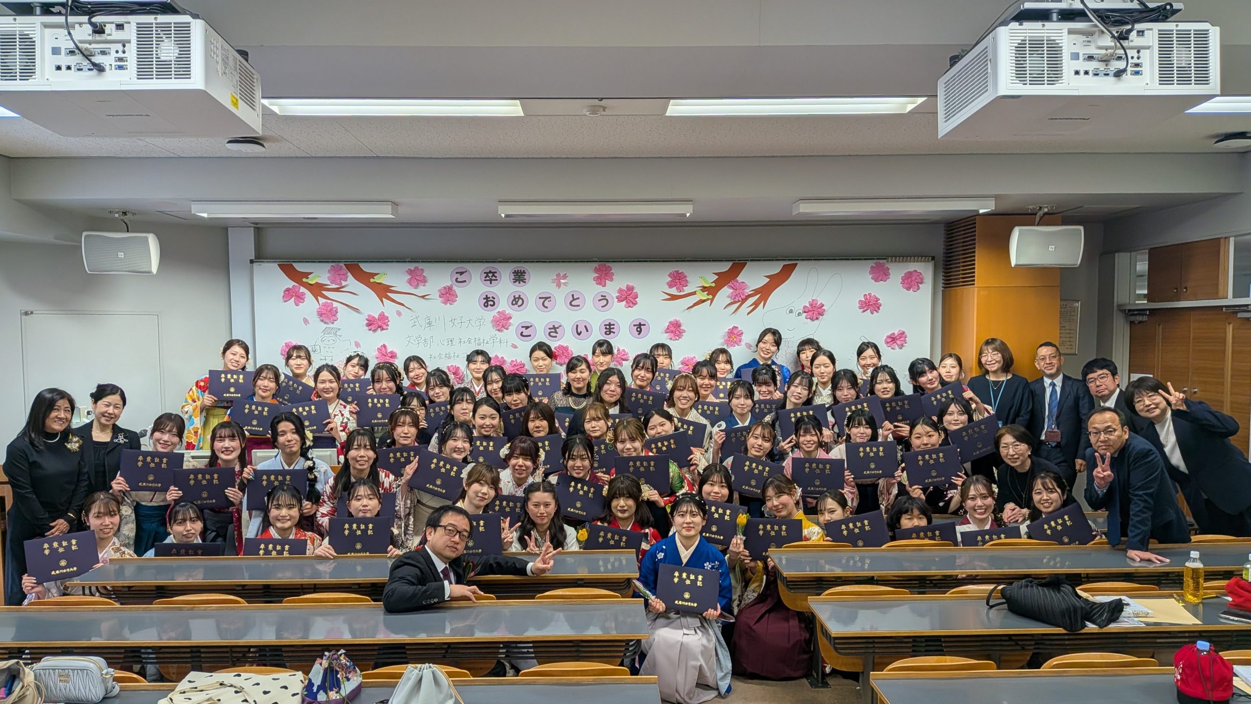 3月19日に『令和7年度卒業式』が行われました! お知らせ 2026.03.26 武庫川女子大学文学部心理・社会福祉学科の社会福祉コース最後の学生たちが、新たな世界へ羽ばたいていきました。コロナ渦という予測不可能な時代の中でも、学びを止めず、仲間と支え合いながら歩んできた皆さんの姿は、誇らしいものです。これからの道のりが、希望に満ち、実り豊かなものでありますように。